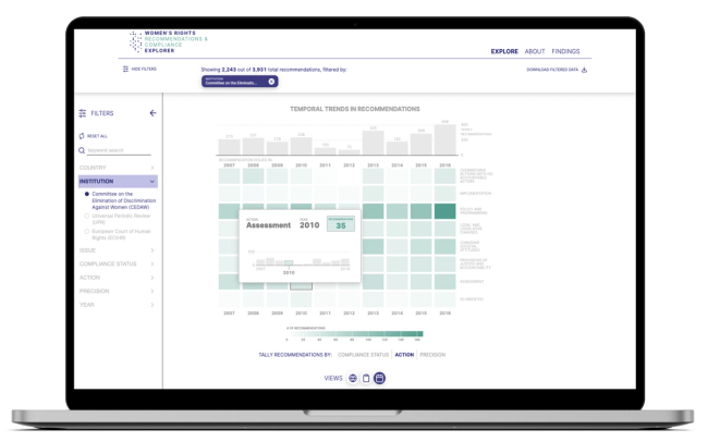 International human rights scholars Jilliene Haglund, PhD (University of Kentucky) and Courtney Hillebrecht, PhD (University of Nebraska-Lincoln) spent years building a database that standardizes women's rights recommendations, and tracks the degree to which countries are compliant. They reached out with an opportunity to design and build a website to present their database as an explorable resource to scholars, policy-makers, and activists.